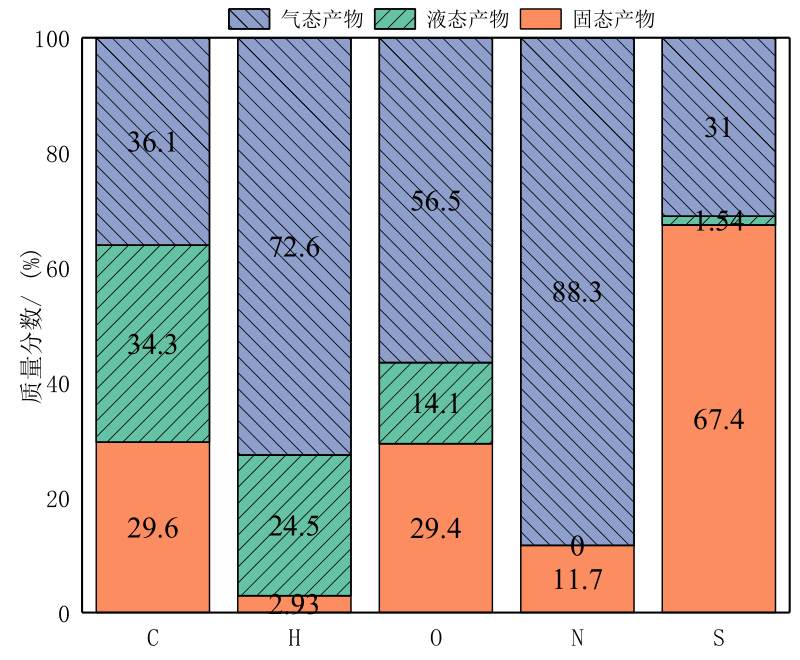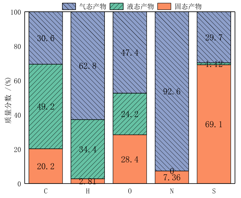 膠粉和機油共熱解時各種元素在三種產物中的分布